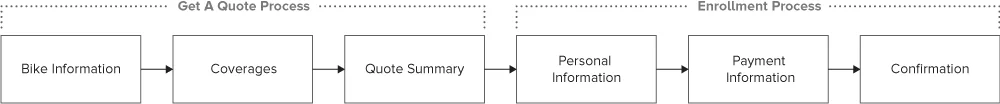 Simplification of a complex process flow. The user experience for getting a quote can be broken into two distinct processes: Get A Quote and the Enrollment. In order to increase the likelihood of a user scrolling, we'll chained them together in a logical and intuitive manner